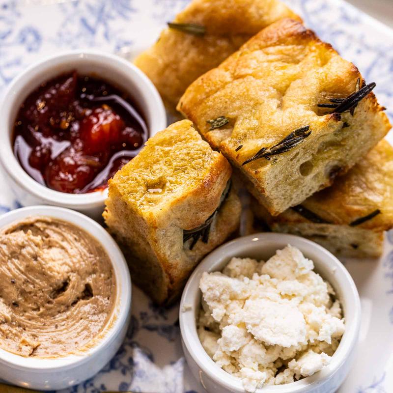 Warm focaccia, caramelized onion, balsamic butter, Lira Rossa ricotta, chile tomato jam, sea salt.